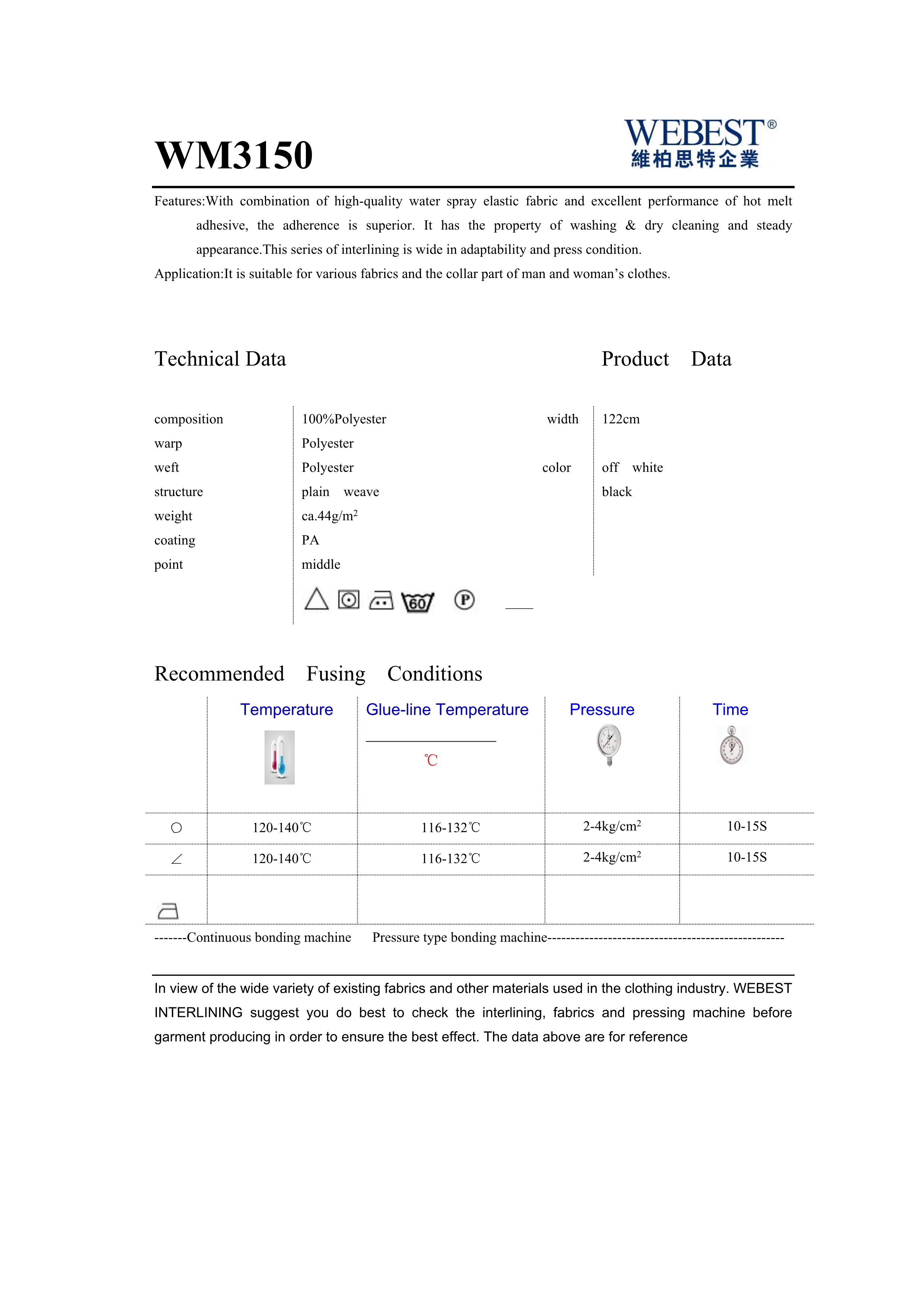 | WM3150 | 44 | 100%PES | plain weave | 122 | black,off white | |